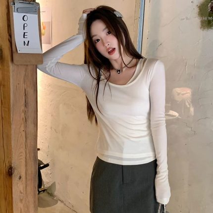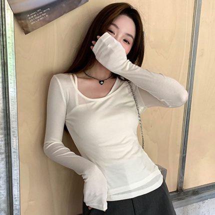 Pure-Aesthetic Fake Two-Layer Long Sleeve Top – Women’s Slim Fit Sun Protection Asymmetric Blouse