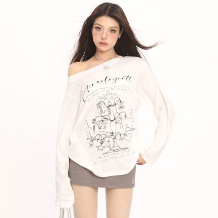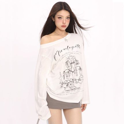 Korean Graffiti Off-Shoulder T-Shirt – Summer Loose-Fit Printed Cover-Up with Sleeve