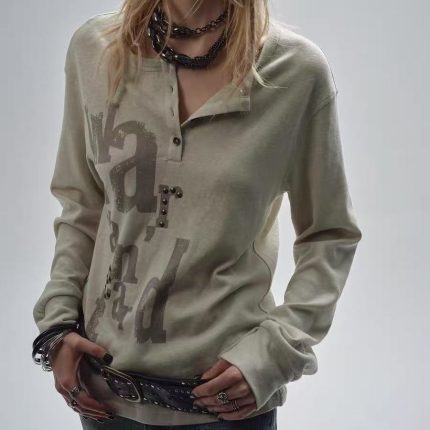 Vintage Two-Tone Half Placket Tee – Punk Texture Sleeve with Stacked Cuff & Crystal Heat Transfer